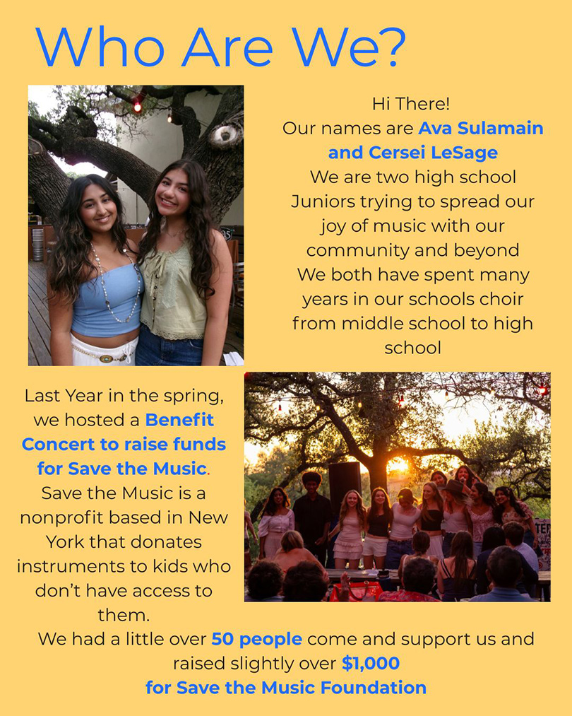 Cersei and Ava, are high school Juniors who attend Lake Travis High School. Together with the members of Hearts in Harmony, are turning their passion for music into meaningful impact. Through their student led initiative, Hearts in Harmony, is hosting a benefit concert to raise funds in support of Texas Music Project’s statewide programs. Their leadership is not only admirable. It is catalytic. By mobilizing her peers and community, they are helping amplify the message that music is not just extracurricular but essential.